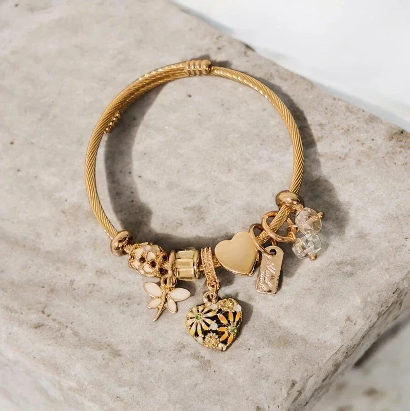 Geef je outfit een luxe uitstraling met dit gedetailleerde bedelarmband. De combinatie van de gouden schakels en de heldere stenen maakt dit een prachtig sieraad voor elke gelegenheid.
