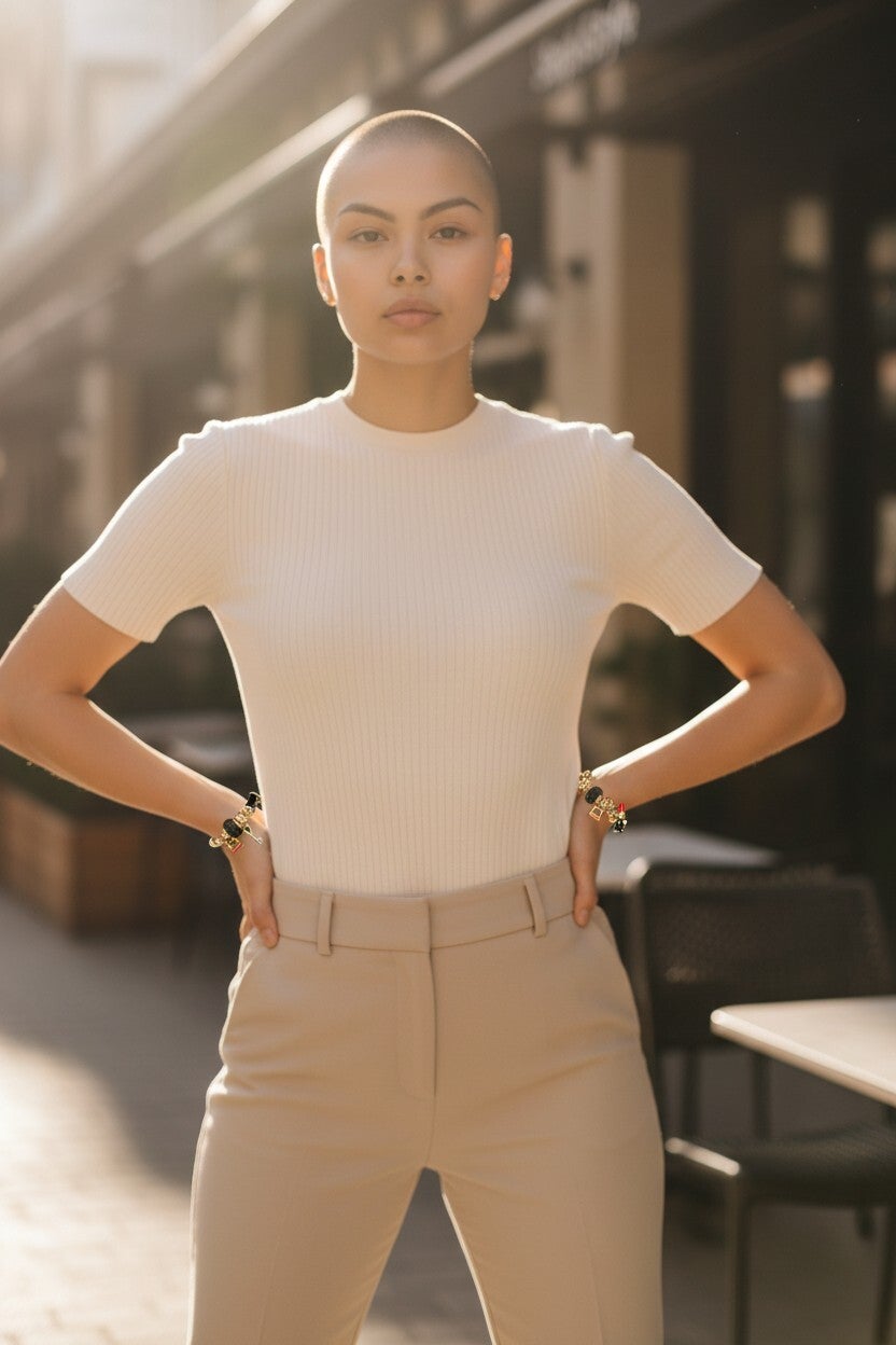 Dit stijlvolle charm‑armbandje is een echte blikvanger. De mix van speelse bedels, diepe kleuren en gouden accenten geeft het een luxe, karaktervolle uitstraling. Dankzij het buigbare ontwerp vormt het armbandje zich elegant om je pols, terwijl de unieke details jouw look een persoonlijke, chique touch geven.