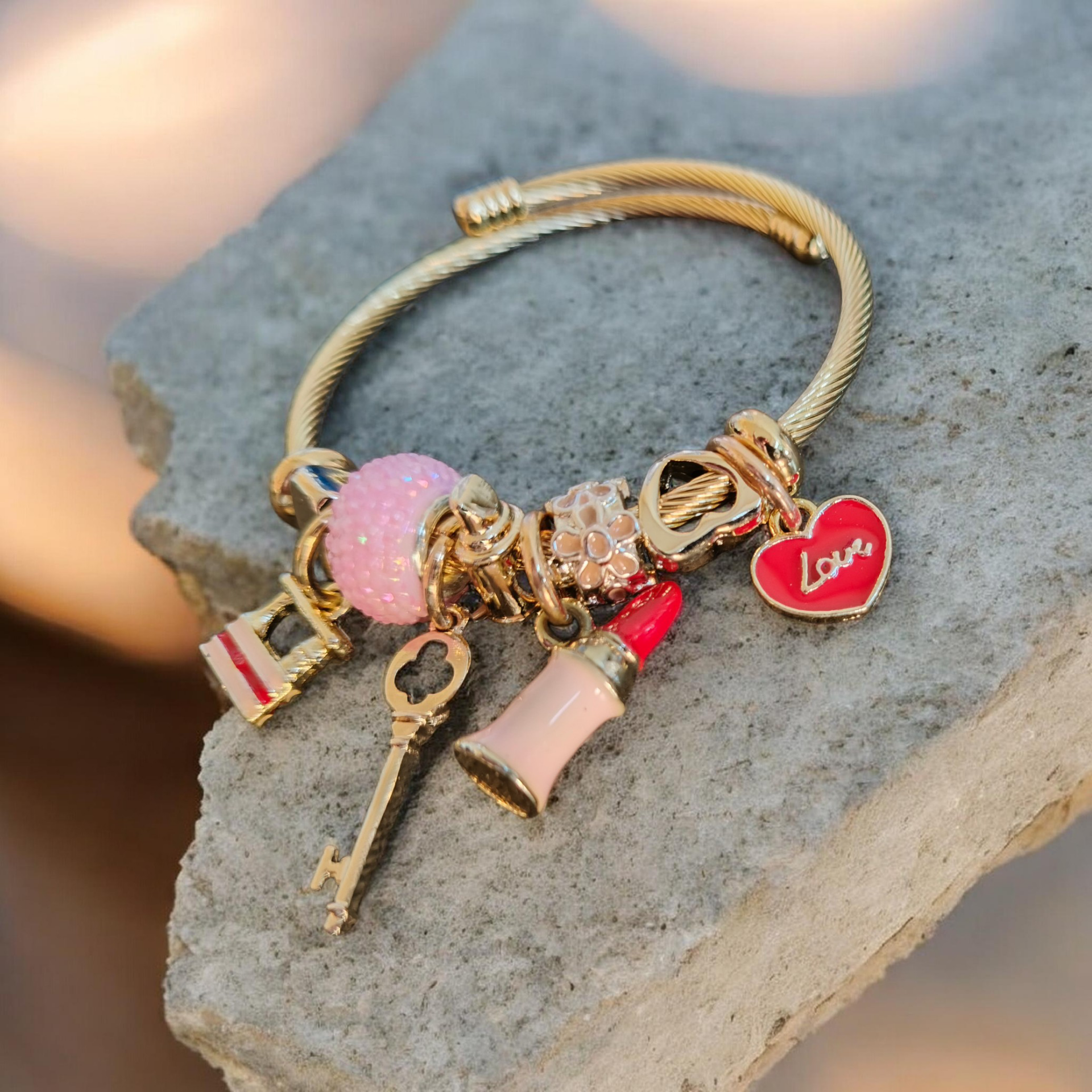 Dit luxe charm‑armbandje is een echte eyecatcher. De combinatie van elegante gouden accenten, speelse bedels en subtiele kleurdetails geeft het een stijlvolle, high‑end uitstraling. Elk bedeltje vertelt zijn eigen verhaal — van liefde tot glamour — waardoor dit armbandje jouw look een persoonlijke, chique touch geeft.