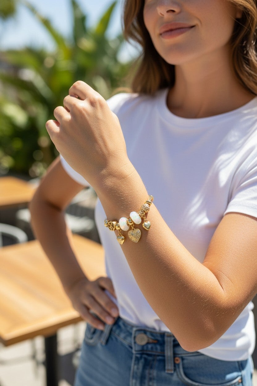 Dit verfijnde armbandje straalt pure elegantie uit. De combinatie van glanzende kralen, opaalachtige accenten en drie sierlijke hartjes geeft het een romantische, luxe uitstraling. De verschillende texturen en gouden details zorgen voor een chique, tijdloze look. Dankzij het buigbare ontwerp vormt het armbandje zich moeiteloos om je pols — comfortabel, stijlvol en perfect voor elke gelegenheid.