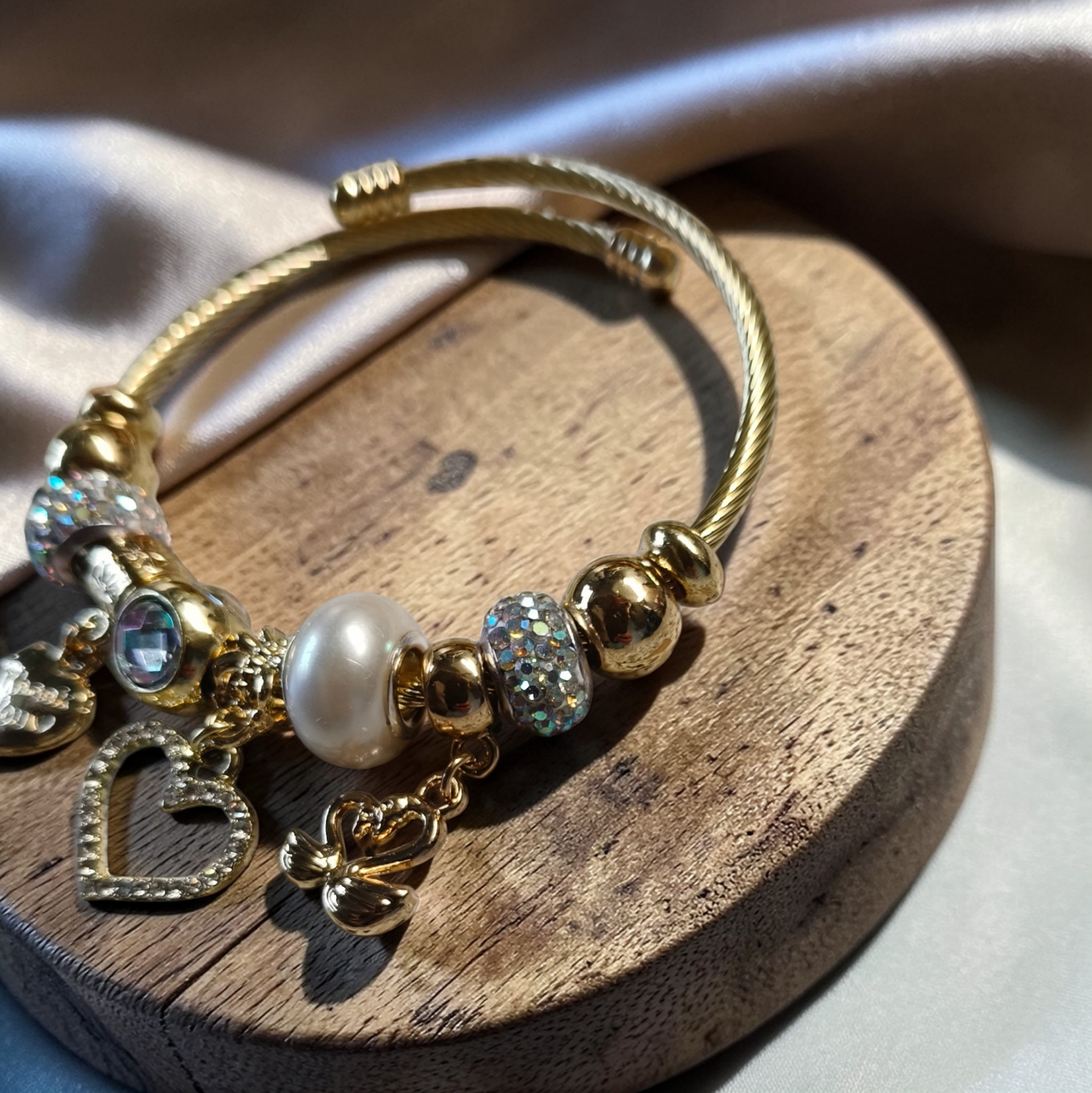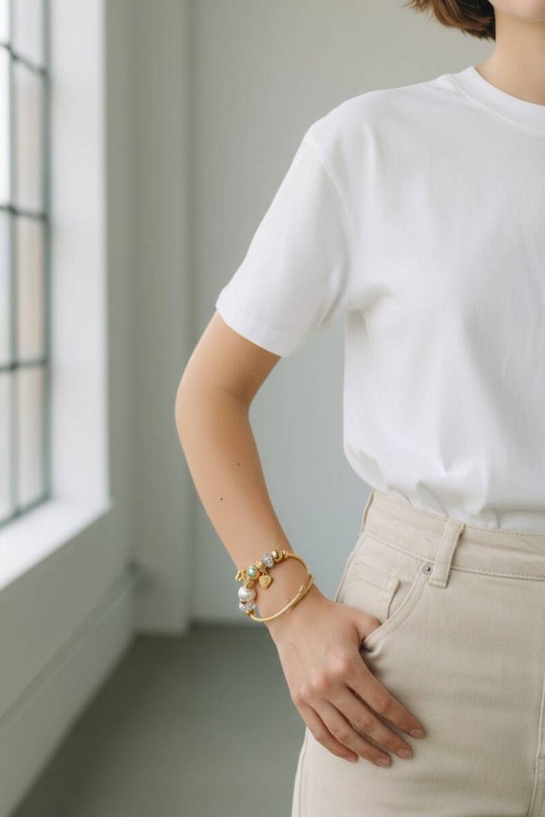 Dit luxe armbandje is een prachtig en betekenisvol sieraad. De combinatie van glinsterende kralen, elegante gouden details en de symbolische bedels — het gracieuze zwaantje en het hartje met “Thank You” — geeft het armbandje een warme, stijlvolle uitstraling. De zirkonen zorgen voor een verfijnde schittering die elke beweging laat opvallen. Dankzij het buigbare ontwerp vormt het armbandje zich perfect om de pols, waardoor het zowel comfortabel als chic is.